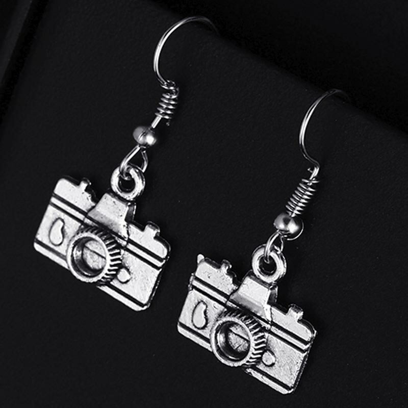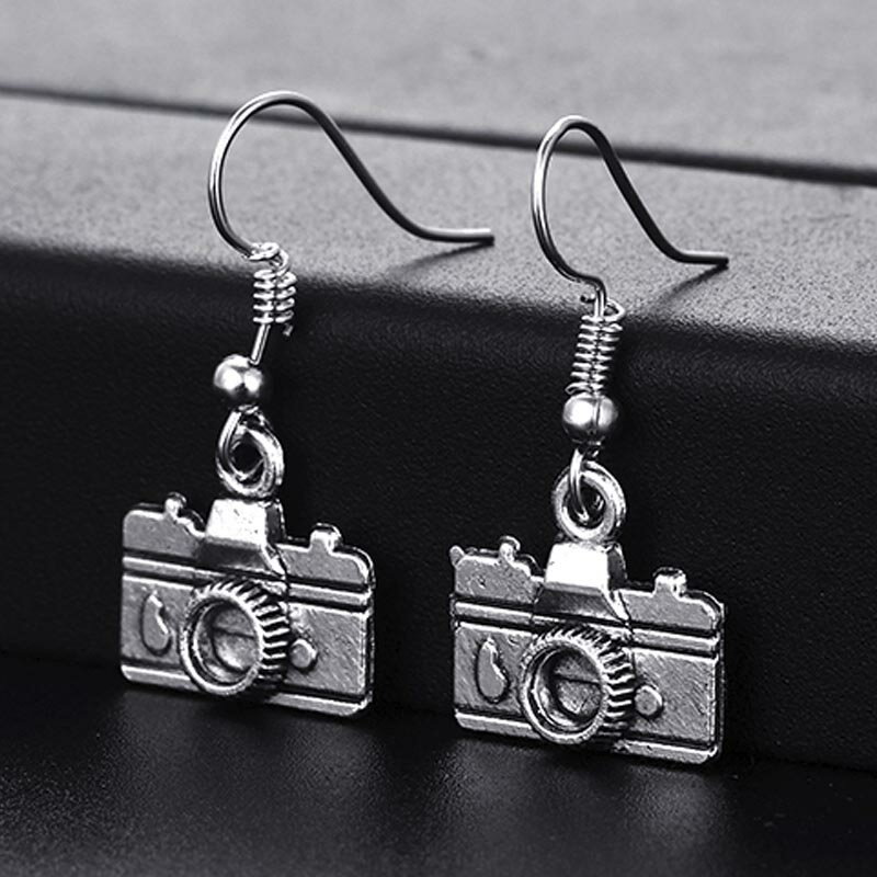 一眼レフカメラのチャーム揺れるフックタイプのステンレスピアス。