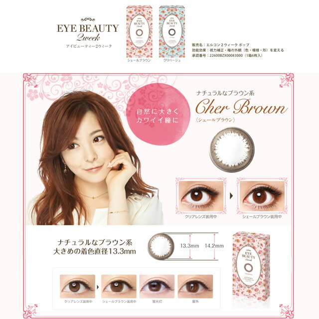 処方箋不要で買えるカラコン◆商品名:アイビューティー2ウィーク シェールブラウン◆モデル:林えりか ◆使用期間:2週間◆DIA:14.2mm◆入数:1箱6枚入×2箱◆BC:8.8mm◆含水率:38.0%◆視力補正用コンタクトレンズ(度ありカラコン)◆医療機器承認番号:22600BZX00083000◆製造国:◆製造販売元:株式会社シンシア◆販売元:視力補正用コンタクトレンズ(度ありカラコン)商品の性質上開封後の返品および交換はご遠慮下さい。